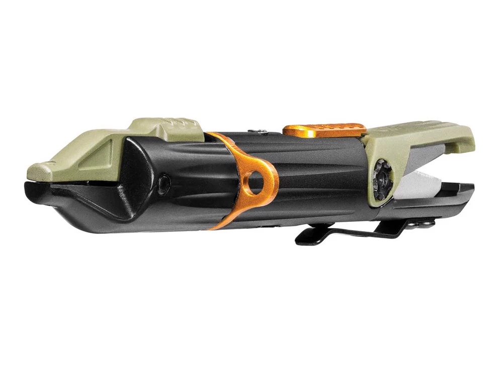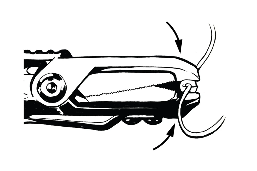 De dubbel micro gekartelde schaar is een innovatieve functie: wanneer deze ontgrendeld is, werkt het als een schaar met een volledig bereik die dikkere lijnen aan kan; wanneer vergrendeld, schuift de schaar iets open voor snel doorsnijden van de vislijn wanneer de LineDriver aan de broekzak wordt geklemd.