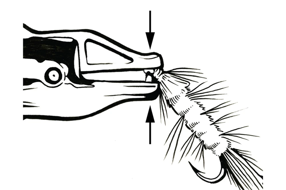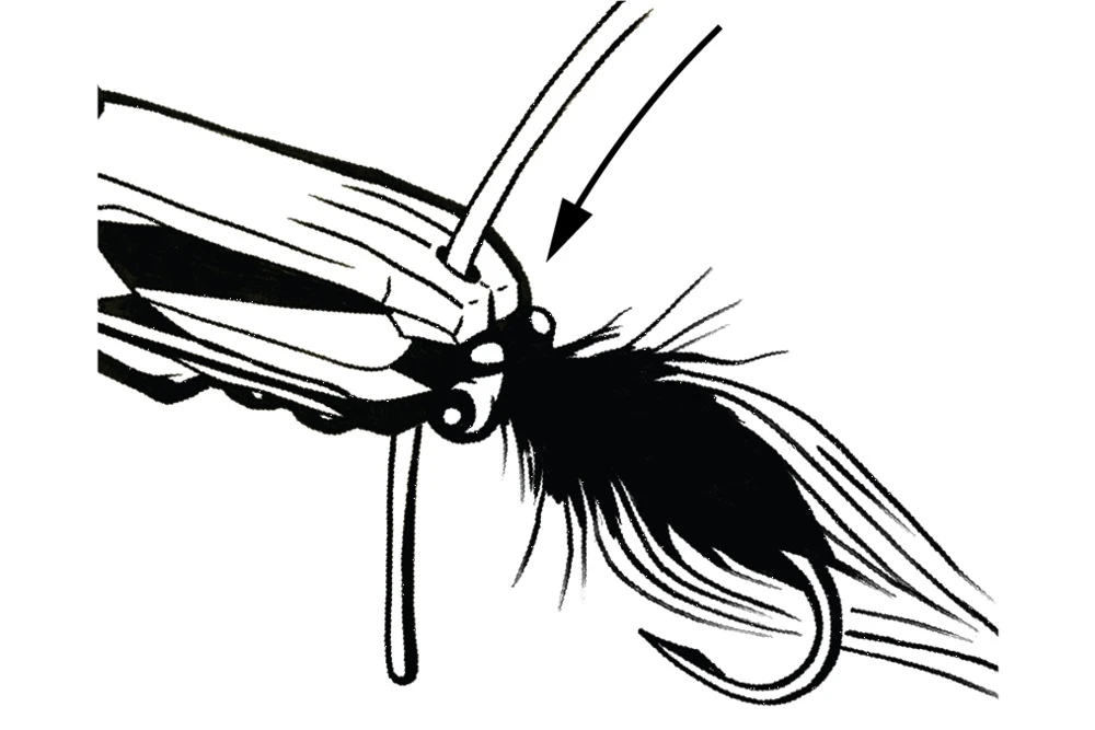 De draaiende klem klemt stevig vast aan een haak of lokaas, waarbij de lijn netjes ronddraait terwijl men de knoop knoopt en de vingers uit de weg houdt terwijl men de lijn strak vastzet.