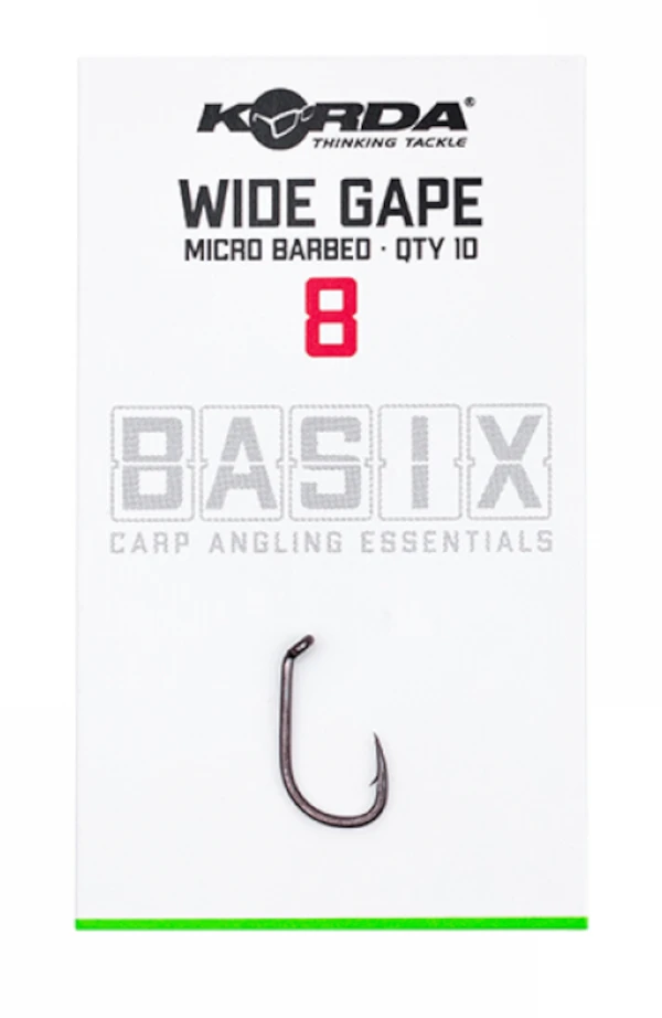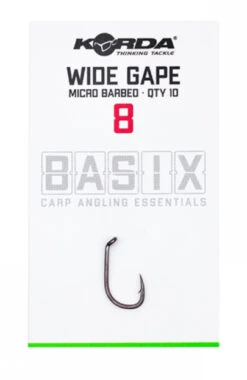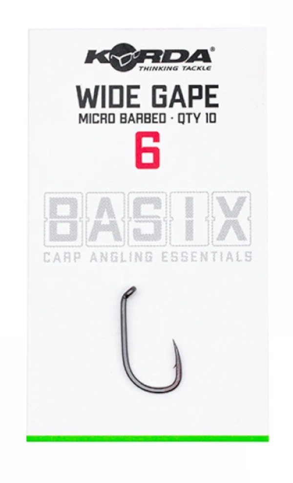 De Korda Basix Wide Gape is in meerdere varianten te verkrijgen. De Basix Wide Gape haak is ontworpen om een perfecte all-round haak te zijn, die gelijk vanuit de verpakking gebruikt kan worden. Hij is breed inzetbaar en is ideaal om te gebruiken bij het vissen met bodem aas, pop-ups of wafters. Dankzij het agressieve, naar binnen gebogen oog, zal de haak snel draaien en grip vinden in de bek zonder daarbij kickers of krimpkous te gebruiken. Door gebruik te maken van de bekende “X” draaddikte is de haak geschikt voor de visserij tijdens de meest ruige omstandigheden. De BASIX Wide Gape is afgewerkt met een onopvallende nikkel finish en haakpunt die is ontworpen om lang mee te gaan. Dit maakt het mogelijk om meer vissen met dezelfde haak te vangen voordat deze aan vervanging toe is. Wel is het van belang om voor het inwerpen te controleren of de haak nog steeds scherp is en deze te vervangen wanneer hij niet scherp meer is. Het model is gebaseerd op de ongelooflijk effectieve originele Wide Gape, een klassiek model die vandaag de dag door vele topvissers gebruikt wordt. Deze haak heeft al vele grote vissen op zijn naam staan!