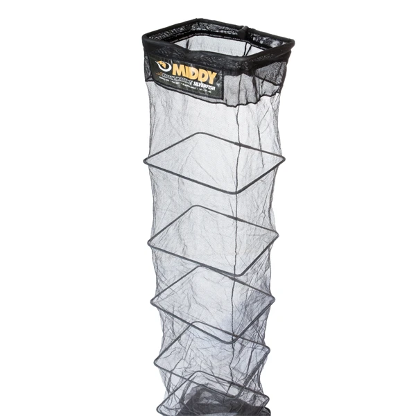 Dit sneldrogende Middy leefnet biedt optimale bescherming aan de gevangen vis. Het net zinkt goed af en is voorzien van een verstelbare hoekvergrendeling met universeel schroefdraad en uitzetbare D-ringen. De stevige, vierkante ringen zorgen ervoor dat het net strak en gespreid over de bodem ligt. Dit leefnet is zevenvoudig gestikt tegen rot, en gaat lang mee.