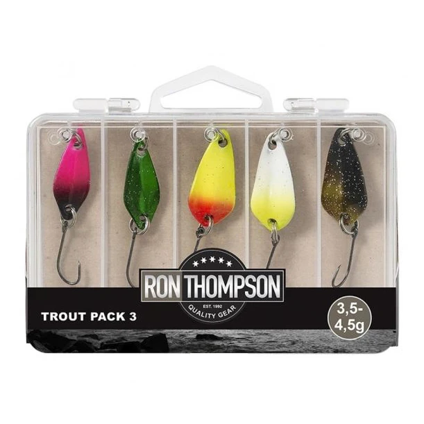 Het Ron Thompson Trout Pack is een mooi kunstaaspakket voor de jacht op kleinere roofvissen. Je hebt de keuze uit vier verschillende packs. Elk pack bevat 5 soorten kunstaasjes met verschillende kleuren en gewichten. Het kunstaas wordt geleverd met een bijpassende opbergbox. Deze kleine kunstaasjes zijn ideaal voor de lichte visserij op onder andere forel en baars.